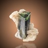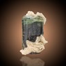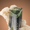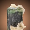 A fine, well formed and bicoloured Elabite crystal to 3,2 cm in lenght accompanied by bladed Clevelandite from well known locality Stak Nala of Haramosh mountains in Pakistan. The Elbaite here has an olive-green base and a white to colourless, multifaced and perfect termination. It is sharp edged and wonderful striated as well. Fine aesthetics with excellent contrast on this great mini.