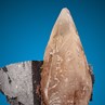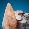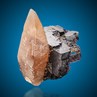 Here we have a fine combination piece with a single, sherry-coloured Calcite scalenohedron to almost 6 cm in lenght, nicely and contrastful perched on a dark-lilac cubed crystal fragment of Fluorite. Both species are sharp edged and nicely terminated with only minor bruising. They have satin to high luster as well and the overall aesthetics is very good due to colouration and contrast.
