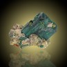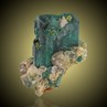 What a well-balanced miniature from the classic locality of Tsumeb in Namibia. A well-formed and undamaged Malachite pseudomorph perched on translucent Cerussite crystals. The color of the Malachite crystal with its beveled edges is deep forest green, the Cerussite is translucent with a vitreous luster. This classic Tsumeb pseudomorph is stunning with both sides good enough to be displayed. The lighter green clusters are Duftite sitting in small vugs and between the Cerussite crystals. Very colorful, aesthetic,and desirable.