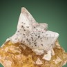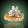 A jumble of translucent, slightly greyish Calcite scalenohedra centrally perched on a plate of honey-yellow Fluorite cubes. Both species are highly lustreous and sharp. The fluorite crystals, for which the Moscona Mine is famous, are also gemmy. Only minimal imperfections on this very aesthetic and contrasting Spanish specimen.