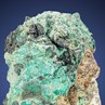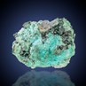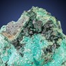 Fairly robust and large clusters of highly lustrous forest green Pseudomalachite abundant in cavities of mint colored Chrysocolla. Pseudomalachite is a not very common Copper phosphate and forms rather sparkling crystal crusts. Large, relatively isolated crystals like this one are pretty rare. From the M´sesa Mine open pit mine that sits just north of the town of Kambove in the southern reaches of the Democartic Republic of the Congo.