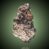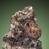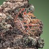 A reddish golden cluster of Rutile crystals with epitaxial growth (so-called Sagenite lattice) perched on aggregates of the Clinochlore variety Ripidolite. Exceptional material from the Swiss Binn Valley.