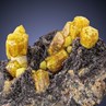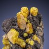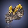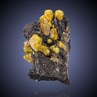 An excellent specimen with six-sided Ettringite crystals to 1 cm on typical for the Kalahari-Mn-Fields, anthracite-brown Manganese-bearing matrix. The deep egg yolk-yellow crystals are sharp, translucent to transparent with a vitreous luster. A specimen with a top contrast and excellent aesthetics. Classic material from South Africa from the late 1980s.