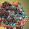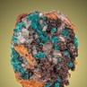Beautiful mint green velvety Rosasite crystal clusters to 4 mm are associated with translucent Calcite rhombohedrons, and perched on gossan matrix. A typical specimen from the Ojuela Mine, rich in contrast and colorful.