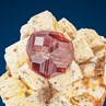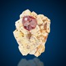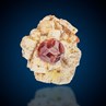 A 1.1 cm measuring Spessartine crystal with a wonderful orange-brown color, a variety of isometric crystal faces and typical striation. It gemmy translucent with a high vitreous luster. The crystal is prominently perched on a cluster of beige-white Pericline, a variety of Albite in alpine type clefts. Great contrast, balance and aesthetics.