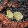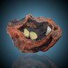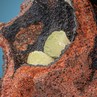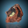 Two perfect Adamite sprays to over 1 cm are aesthetically perched in in a wide-open vug of typical Ojuela Mine gossan matrix. They are lemon yellow with a vitreous luster (and fluorescent!) A specimen with great contrast of yellow Adamite on black and red matrix.