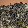 An excellent small cabinet-sized specimen with prismatic, mostly well-terminated Diopside crystals to 0.8 cm are associated with prismatic milky Quartz crystals. The color of the Diopside is a very dark olive green, but not uncommon for the Marki Khel locality. Top piece!