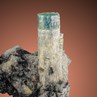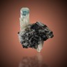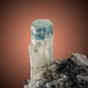 A 1,9 cm measuring single Aquamarine crystal accompanied by acicular, jet black Schorl. The base features a very pale gray white colour with a hint of blue, what is actually difficult to recognize. The cap is showing a distinct blue colour with an almost intact termination. Classic material from a decade or so ago.