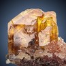 Here we have a great Pöhla Baryte and when one says the terms "golden Baryte" the collector can think of several localities, but these robust, sharp, chisel-shaped crystals from this old, important Silver mine have always been the historic standard to which others are compared. This well-trimmed miniature sized specimen features a fine cluster to 3,0 cm on edge, nicely perched on a crystalline Quartz matrix. The specimen displays 360 degrees, with the gemmy and lustrous crystals in very good condition. They were collected on and off over the Cold War years and stashed. After a brief flood to the western market when the Wall fell, they dried up. Definitely a highly aesthetic specimen in splendend condition.