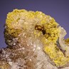 Cauliflower-shaped clusters of quince yellow Mimetite crystals are associated with glassy translucent Calcite crystals. When I took a closer look at the specimen under the microscope, just as I was uploading the photos for the auction, I discovered that the brownish-black coating on some of the Mimetite clusters are fine black metallic needles. This could be Plattnerite, a Lead oxide associated with Mimetite, and reported by Peter Megaw from the 4th level of the San Antonio Mine (MinRec 2018, Jan-Feb p125).