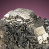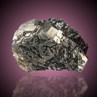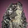 This is a fairly large cluster of “golden” Pyritohedrons associated with jet black metallic Hematite. The sharp Pyrite crystals are almost 5 cm tall and show a metallic luster. On both sides of the specimen, one can clearly see negative impressions of dissolved thin Hematite blades, as well as remaining Hematite crystals in situ.