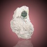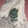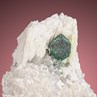 You are looking at a perfect gray Schwazite crystal 0.7 cm in size in a Barite-Quartz vug. It is metallic with some light green Malachite coating. Schwazite is the Mercury-bearing variety of Tetrahedrite.