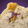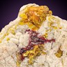Lorandite is a highly rare thallium arsenic sulfide and here we have a deep red, 1.5 cm measuring aggregate along with yellow orpiment. Large crystals of a rare species from the classic Macedonian site of Allchar. NOTE: Mineral collecting at Allchar is only allowed with permission from the University of Skopje. The area will be declared a protected site. Several collectors without this permit were arrested by police (situation in 2010). (mindat)