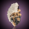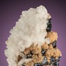 Another top specimen from the Starí Trg Mine of Trepča, and most likely mined in the 1970s. Typically, Trepča Rhodochrosite is often pink with a noticeable brown tinge. The spherical clusters here reach a diameter of 1.5 cm and are wonderfully aesthetic and contrasting with black Sphalerite crystals on the display face. The backside features wonderful snow-white Calcite scalenohedra to over 1 cm.