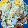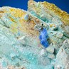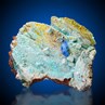 I vividly remember the day when my wife Karin and I discovered this pocket. It was just a 10 cm in diameter measuring whole in the solid rock,- but in the rear area of the cleft we saw a large mustard-yellow stalked crystal. We brought our whole equipment with generator and large Hilti drill down to this place and worked our way through the ~ 1m thick rock. After almost ten days of hard work the pocket was opened but the crystal we saw, was only a yellow coloured Gypsum. Fortunately at a few places of the pocket we found the finest European Cyanotrichites ever. And this specimen is one of them. Of course not among the best of the find, but a good specimen with acicular light blue and also azure blue crystals of Cyanotrichite, perched on artichoke-shaped Calcite crystals, which are coated with mustard-yellow, analysed Cuprocopiapite and light mint coloured Spangolite. A few weeks later some guys checked out that there is a pocket and veritable caravans went to the discovery site. But they never got out a specimen of this specific quality and they rather distroyed the rest of the specimens. So this is superb and rare specimen is still hiytory due to the fact, that the yield included round about 3 dozens of good pieces, and most of them dispersed in worldwide collections.