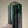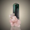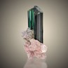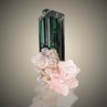 This is a stunning, vibrant and classic style of gemmy green Elbaite tourmaline crystal superbly accompanied by light pink Rose Quartz. Such combinations are typical for the locale but exceeding rare and desired, compared with most of the other Brazilian Elbaite combos. The breathtaking deep colour and transparency are very apparent in the photos, enhanced by the faint vertical striations along the prism faces that display great luster. The faces of the sharply pyramidal termination throughout save have a prominent glassy luster. The elbaite crystal is completely gem and the deep green colour contrasts wonderfully with the Rose Quartz. This is a superb, completely transparent crystal that has no edge chatter what makes this great specimen more valuable. This specimen has no repair and is suitable for highest aesthetic demands. This miniature is a masterpiece all the way - Just superb. For a better demonstration of the superb colouration I used minor backlight.