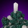 What an aesthetics and contrast!!! Classic hexagonal prismatic crystals of Aragonite-varietal Tarnowitzite nicely set on botryoidal Malachite from the celebrated Tsumeb Mine of Namibia. Tarnowitzite reaches its zenith at Tsumeb, characterized by this unique elongated crystal habit and a fine clean white colour. This specimen with a matrix of deep green Malachite spheres features several lustrous and translucent Tarnowitzite crystals with white, lucent prism faces and superb pyramid terminations. Great aesthetics on this almost pristine 360° specimen.