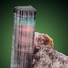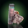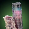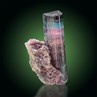 This is a wonderful multicolored Tourmaline perched on typical pegmatite marix of Lepidolite and Feldspar. It is from the well-known Pederneira Mine near the municipality of São José da Safira in the state of Minas Gerais, Brazil. A 3.7 cm tall, perfect long prismatic Elbaite with a perfect, flat triangular termination with slightly beveled edges. The color changes from a clear raspberry red throughout, changes to slightly blue edge areas and turns into a wonderful indigo blue. The termination, which appears black at first glance turns out to be deep purple under the lense/microscope. A top piece of a very special kind and a feast for the eyes for every aesthete.