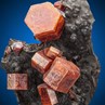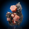 This elegant miniature sized specimen comes from early finds in Taouz in the 1960s when the Vanadinites from Mibladen were not yet known. This is a contrastful and extremely attractive piece of red Vanadinite on Coronadite. Several dark red, translucent, hexagonal Vanadinite crystals up to 1.3 cm in diameter are loosely set on a mounded surface of satin-black Coronadite. The Vanadinites are luminous and have a bright, silky luster. Many specimens from here contain the black mineral commonly referred to as "manganese oxides" or "Goethite", but this is actually Coronadite and it makes a rustic and beautifully contrasting combination specimen. Coronadite is a lead-manganese oxide and not particularly rare, but as in this case, it makes a dramatic background.