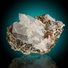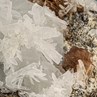 Two rare species as an excellent combination piece,- brown tabular Roweite crystals and numerous, relatively stout, elongated white Olshankyite crystals up to 1.2 cm long. Roweite is a very rare calcium manganese borate with hydroxyl. This specimen features a beautiful rosette, nearly 1 cm in diameter, of slightly translucent, rich tan coloured Roweite on matrix. These all came from a few small pockets at an intersection in the mine and "evaporated" onto the market. They are the finest species in the world and this is a very good combo.